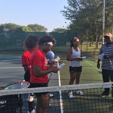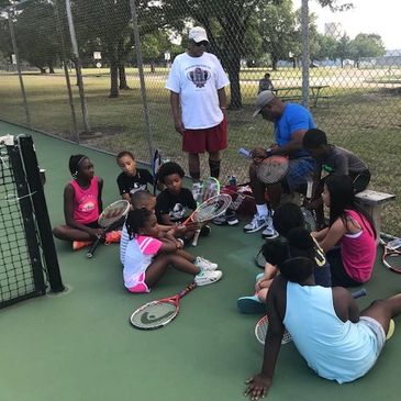 Coach Ron Thompson and Coach Willie Whitaker are discussing the parts of a tennis racquet with the 10 and Under age division.